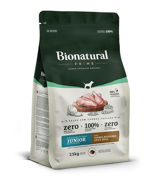 Carne fresca (mín. 3% – carne separada mecánicamente de pollo e hígado de cerdo), harina de vísceras de ave, harina de chicharrrado, huevo en polvo, arroz partido, sorgo integral molido, omega 3 [aceite de pescado y biomasa de microalgas (Schizochytrium sp.)], aceite de ave, avena (mín. 3,95%), arándano (míno mínimo 0,015%), coco en copos (mín. 0,015%), plátano, manzana, fibra de caña de azúcar, levadura de cerveza inactivada deshidratada, extracto de